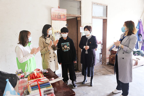 3月18日下午,公司党支部书记周婉华、支部委员赵永华、工会主席王芳在村委工作人员陪同下,来到柘林镇陆同学家中,为他圆了梦想,鼓励他要坚强克服困难,希望他早日成长为一个对家庭、对社会都有贡献的人。意外得知当天正是陆同学的生日,我们带去了生日蛋糕,并唱起生日歌为他送上了最美好的祝福。陆同学的眼角溢出了泪花。