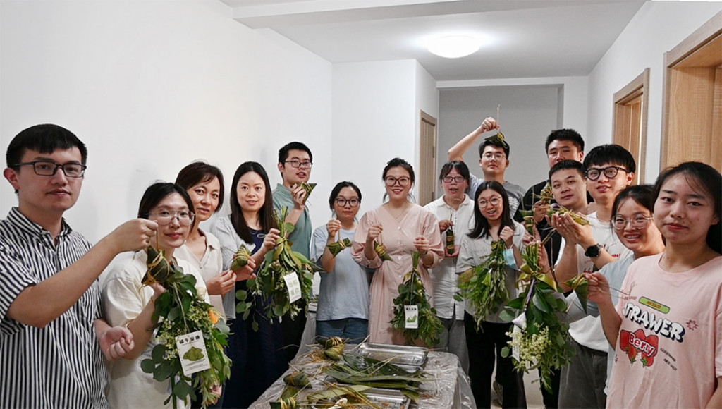活动开始前由党支部委员、工会主席陈英取一勺药水为所有青年员工淋手,以取去秽消灾、幸福平安之意。众人纷纷互相请教、相互学习,一折叶、二盛料、三压实、四包裹、五扎绳,小小的粽子需要很多耐心和技巧。在一片欢声笑语和粽香四溢中,不一会儿,一个个造型各异的粽子摆满了桌子。不消片刻,清香四溢、沁人心脾,充满着节日味道的粽子就新鲜出炉了。“手执艾旗招百福,门悬蒲剑斩千邪”。众人齐上手,将准备好的艾草、菖蒲叶、香囊等材料,自由搭配、用心修剪,不多时一束束艾草花束便完成,现场散发出阵阵清香,大家在门上挂上自己制作的艾草花束,寓意祈福辟邪保安康。